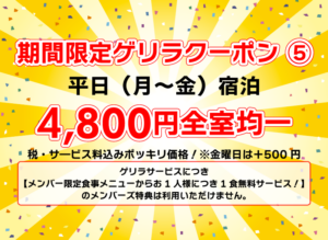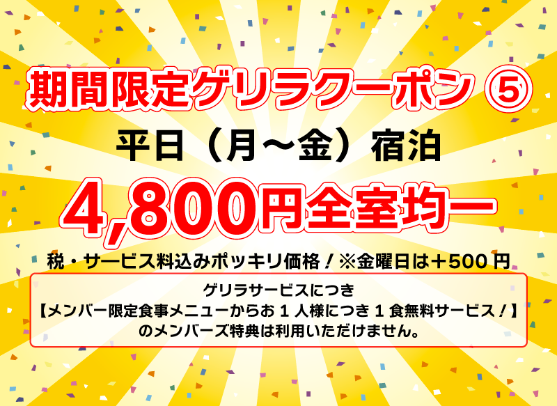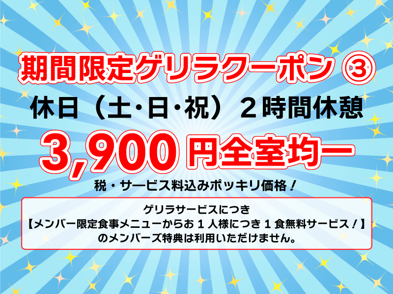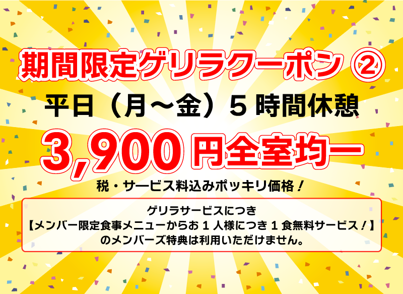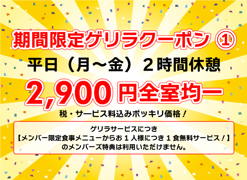 - 必ずチェックイン時にフロントにて入室前にご提示ください。入室後のクーポンのご利用は出来ません。
